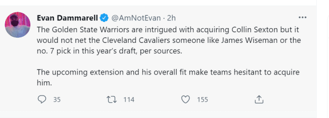 勇士的跟队记者Alex Didion解析了这一交易流言。他认为出于多方面原因,勇士得到塞克斯顿的机会很小,甚至近乎为零。