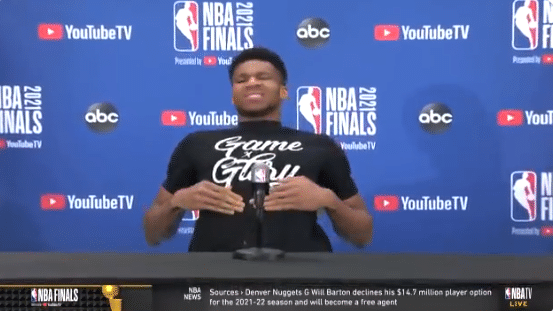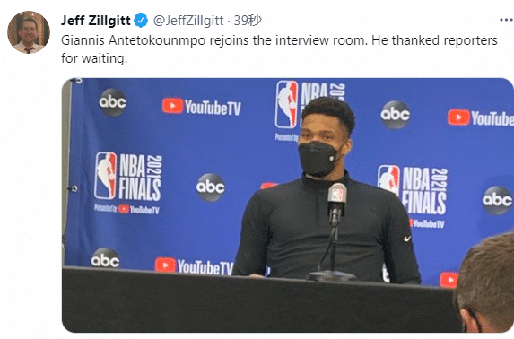 之后字母哥重返新闻发布会现场,继续接受采访。