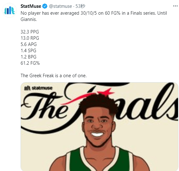 总决赛至今,字母哥场均轰下30+10+5且投篮命中率高达至少60%成此项纪录历史第一人——场均32.3分13篮板5.6助攻1.4抢断1.2盖帽,命中率61.2%;目前来看,字母哥是总决赛MVP的头号候选人,打出巨星级别的表现,带领雄鹿夺赛点。