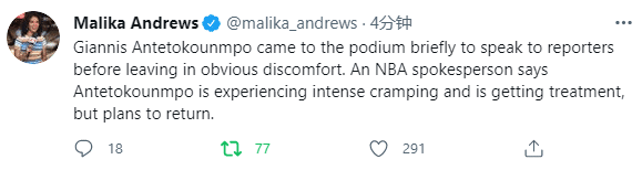雄鹿赢球赛后,字母哥逆天空接冲上热搜引热议,不过赛后字母哥因身体不适早早结束采访,采访只说了几句话就离开现场,捂着腹部十分痛苦,身体出现明显的不适,据名记Malika Andrews报道,字母哥遭遇剧烈的痉挛,正在接受治疗,但预计不会缺席下一场比赛。