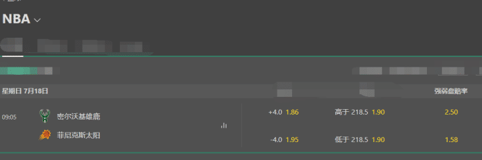 赔率显示,太阳获胜是1:1.58,而雄鹿获胜是1:2.5。这是一个较大的差距,相关机构明显看好太阳。而总决赛赔率目前的数字是,太阳1:1.66,而雄鹿是1:2.3,太阳依然被看好。