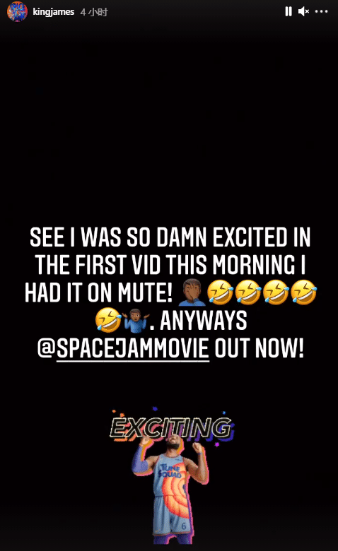 来源:JRS直播网07-17 15:15JRS直播网讯北京时间7月17日,詹姆斯主演的《空中大灌篮之新传奇》正式公映,上映之后老詹的心情是怎样的?情绪激动,躺在床上大喊大叫,录视频表达心情居然忘记开声音,还直呼:我爱你们,黑子们!