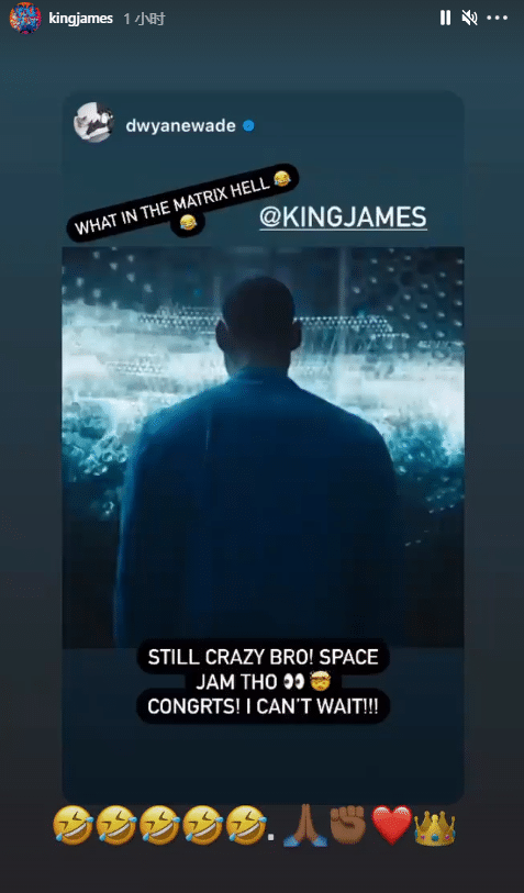 詹姆斯新电影上映第一天,韦德晒电影预告片,配文:这到底是怎么回事,太疯了兄弟,恭喜你,我等不及要看《空灌2》了。