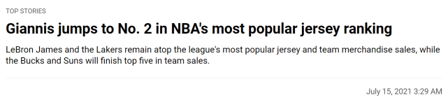 NBA公布下半季球衣销量排名!詹姆斯湖人均排第一,字母超三大球星
