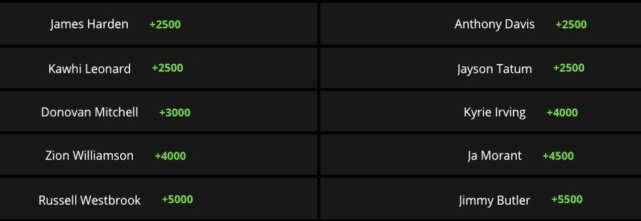 杜兰特、字母哥和库里三人的赔率同为+800,并列第三。杜兰特大伤复出后已经打出MVP级别的表现,篮网的战绩也没有问题,能否保持健康是他冲击这一奖项的关键。字母哥已经连续两年拿到常规赛MVP,他依然很有竞争力。如果勇士在新赛季重新崛起,状态很好的库里也会成为MVP大热门。