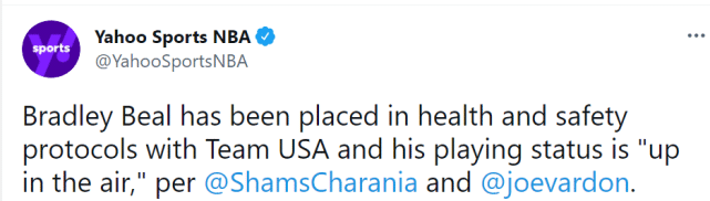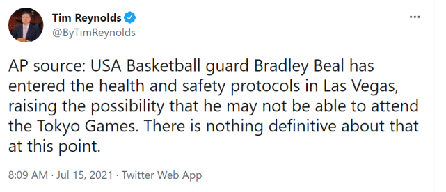 美国男篮再遭打击!比尔因健康安全协议被隔离,名记:可能缺席奥运