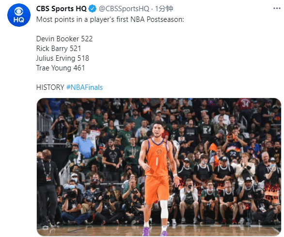 布克爆发的同时还创纪录,职业生涯第一次打季后赛总得分已经超越里克-巴里和朱利叶斯-欧文两大名宿,成为NBA此项纪录历史第一人——首次打季后赛总得分最多的球员。