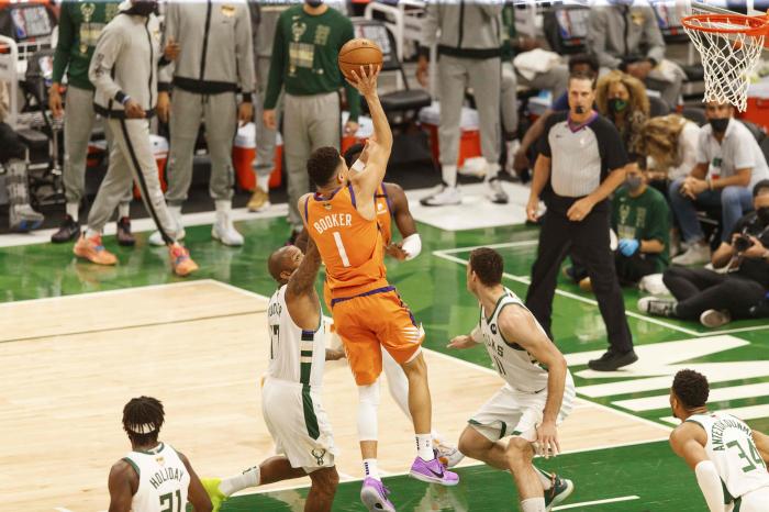 比赛正式开打,布克开场便连得4分,太阳10-4打停雄鹿,不过之后布克手感有所下滑,首节7投3中拿到8分,三记中投和两罚全中;第二节,布克防守端被霍勒迪肘击到鼻子,之后他坐回替补席;当雄鹿反超比分时,布克上场独挑进攻大旗,连续投进高难度中投,漂移后仰跳投太像科比,单节8中5独砍12分火力全开。