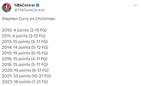 库里再次在年终大战中迷失,全场21投7中、三分13中3狂打铁,10次出战年终大战仅1次得分突破30分,另外9场得分均未超过20分;库里生涯至今,年终大战的战绩为4胜6负,场均15.6分,投篮命中率31.7%(164投仅命中52球),三分命中率23.1%。