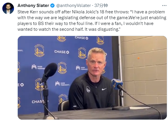 本场比赛,约基奇获得了18次罚球,在赛后听到这个数据之后,科尔表示:我们现在是在立法把防守排除出比赛,我们鼓励球员以胡扯的方式走上罚球线,如果我是一个球迷,我不会想看今天下半场的比赛,就是一直骗哨子、骗哨子,但是裁判必须要吹,因为他们就是这么被(规则)指导的,我们允许球员这么做,他们也很好地利用了这一点,在罚球线上游行,这是令人恶心的。