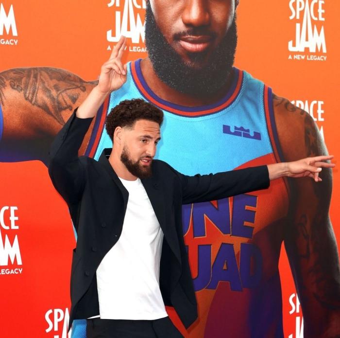 勇士球星克莱-汤普森身穿白色T恤搭配黑色西装亮相,他在出演了《空中大灌篮2》,甚至拄拐拍摄电影。