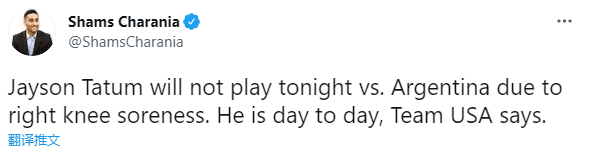 来源:JRS直播网07-14 11:34JRS直播网7月14日讯 ,美国男篮和阿根廷热身赛开打之前,名记shams报道,美国男篮官方宣布,由于右膝酸疼,凯尔特人球星塔图姆将因伤缺席本场比赛,被列为每日观察名单之中。