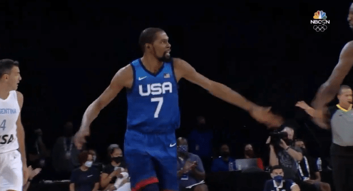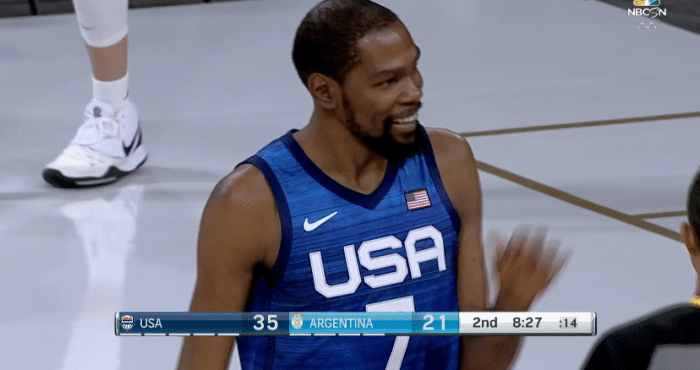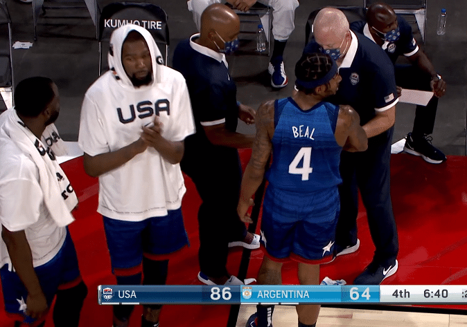 首节比赛,美国男篮进攻十分犀利,外线投进6记三分火力全开,再加上比尔等人疯狂攻击禁区,单节33-19领先阿根廷14分,杜兰特单节5投3中拿到8分,两记三分和一记中投;到了第二节,斯科拉带队追分,一度追到10分以内,不过利拉德和比尔得分稳住局面,半场结束前,杜兰特连续得分,单挑斯科拉投进压哨中投。