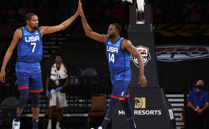 末节美国男篮继续拉开分差,拉文杀到禁区大力砸扣2+1宣泄情绪,分差一直在20多分,杜兰特末节全程坐在替补席观战,提前一节打卡下班;比尔手部有出血的情况,杜兰特头顶毛巾走过来,站场边为队友鼓掌;美国男篮终于赢了。