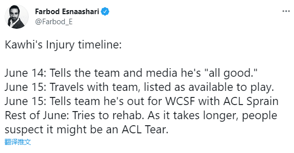 快船跟队记者Farbod Esnaashari连续更新多条动态,发推:小卡6月15日告诉球队和队友他的身体很好,6月16日快船宣布小卡随队出征并且可以出战西部半决赛G5,可之后他告诉球队自己遭遇十字韧带扭伤,因伤休战,之后小卡一直康复,由于康复周期太长,外界猜测他遭遇十字韧带撕裂。