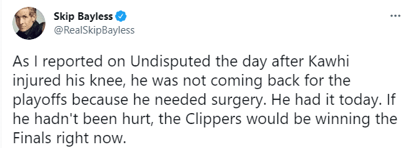 不久前,名嘴斯基普-贝勒斯发推:正如我在小卡受伤第二天所报道的,他季后赛没有复出,因为他需要接受手术;今天他已经做了十字韧带修复手术,如果他没有受伤,快船将会赢得今年的总决赛。