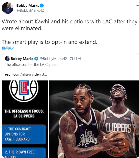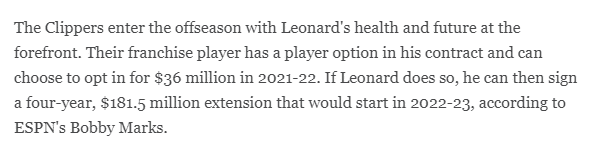 小卡惨遭重伤且接受手术,至少伤停9个月,那么休赛期他将作何选择?薪资专家Bobby Marks表示,小卡最明智的做法是执行3600万美元的球员选项,然后在明年夏天和快船续签4年1.815亿美元的大合同;如果小卡拒绝球员选项,他最多可以和快船签下4年1.76亿美元的续约合同。