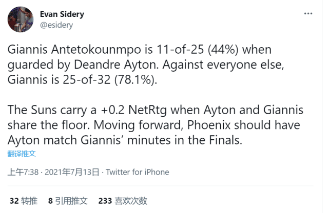 据统计,目前字母哥总决赛命中率达到62.5%。这三场比赛,当艾顿防守字母哥时,后者的命中率仅为44%。而当太阳其他人防守字母哥时,后者的命中率则高达78%,完全被希腊怪兽打爆了。