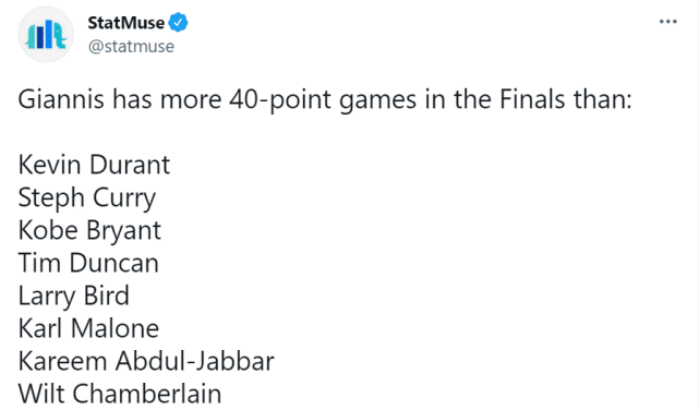 来源:JRS直播网07-13 11:16JRS直播网讯 北京时间7月13日,在总决赛第三场20分大胜太阳后,目前雄鹿大比分1比2落后太阳。字母哥过去两场表现不可思议,连续两场送出40+10。在总决赛两次砍下40分,字母哥目前并列历史第7,仅次于杰里韦斯特、詹姆斯、乔丹、奥尼尔、贝勒、里克巴里。而杜兰特、库里、科比、邓肯、拉里伯德、卡尔马龙、贾巴尔、张伯伦这些历史级巨星,在总决赛都是仅仅只拿过1次40分。