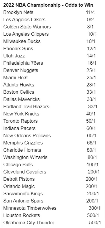 美媒博彩公司开出的下赛季夺冠赔率:篮网、湖人、勇士、快船和雄鹿前五,太阳第六。火箭和雷霆并列倒数第一。其中,篮网4赔11,湖人2赔9,勇士1赔8,快船雄鹿1赔10,太阳1赔12……而火箭和雷霆都是1赔500。也就是说下赛季的联盟格局基本跟本赛季类似!