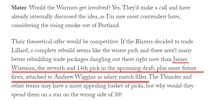 Anthony Slater表示,勇士的报价将很有竞争力,若开拓者决定交易利拉德,勇士可以提供詹姆斯-怀斯曼、维金斯、今年首轮7号和14号选秀权以及多个未来首轮选秀权;Anthony Slate还表示到了最后时刻,勇士会积极促成这笔交易的。