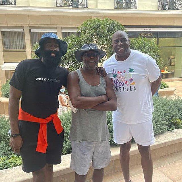 合影中,魔术师约翰逊身穿白色短裤和T恤,明显的一处是他的右腿明显比左腿细很多,可能是拍摄角度问题,也可能是篮球生涯导致的后遗症;“神盾局局长”塞缪尔站在中间,哈登身穿黑色短裤和短袖,戴着一顶遮阳帽,腰上系着橘色外套,三人都面带笑容。