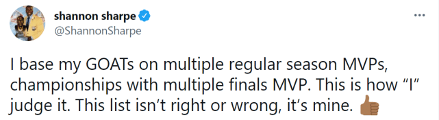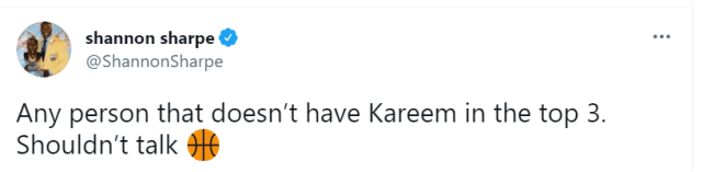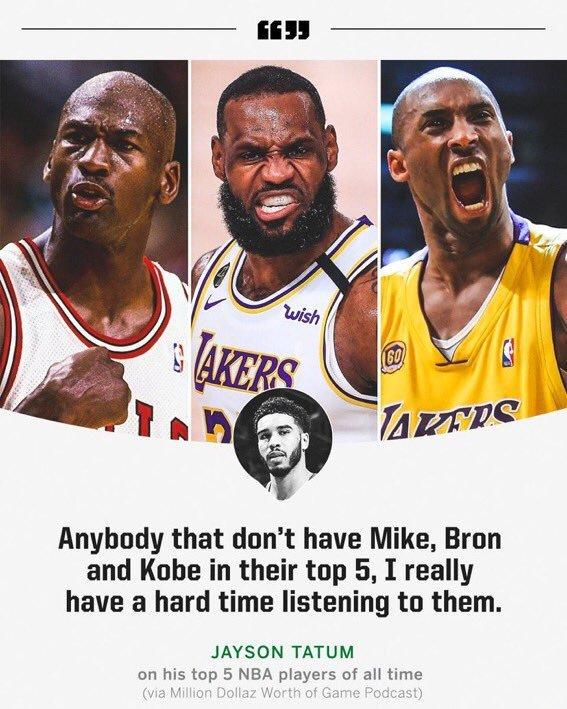 有球迷晒出了塔图姆近日的言论:“任何没把乔丹、詹姆斯和科比放进前五的名单,我真的不想听。”这也说明了塔图姆心中,这三人是历史前五的绝对组成部分,而夏普也用相同句式回应了这位球迷:“任何没把贾巴尔放进前三的名单,也别聊啥球了。”