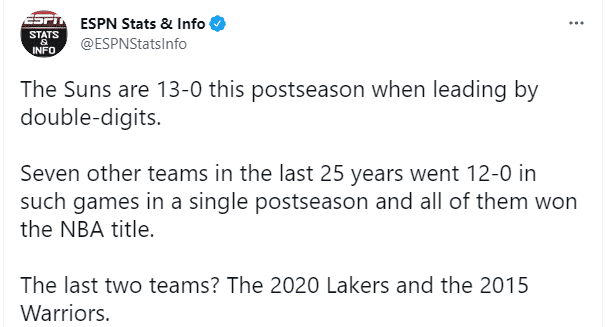 NBA近25年在季后赛领先两位数12胜0负的七支球队全部夺冠,目前太阳已经13胜0负——领先两位数的比赛全部赢球,这不仅是太阳赢球定律,更是太阳夺冠的一大神奇定律;最佳有这样表现的两支球队分别是20年总冠军湖人队和15年总冠军勇士。