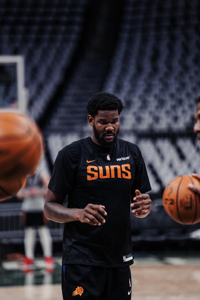 布克同样专注于训练,不过训练之余,布克咧嘴大笑乐开怀,如此一幕可以看出太阳全队认真训练,队内氛围也特别好;此前采访时,布克表示客场比赛能让球队更加团结,防守从来不是一个人的事。
