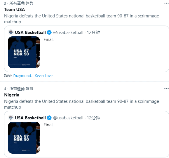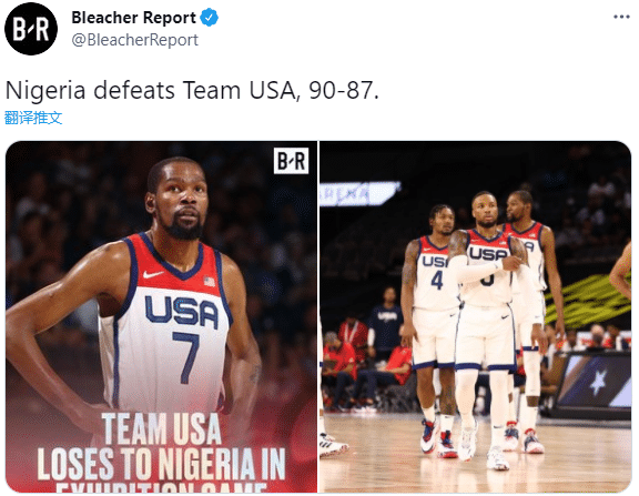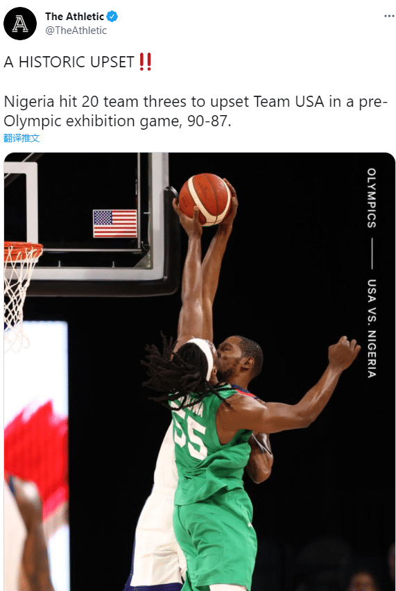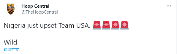 美媒《露天看台》晒照发推:尼日利亚击败了美国队,90-87;美媒Hoop Central发推:尼日利亚让美国队感到沮丧,太狂野了。