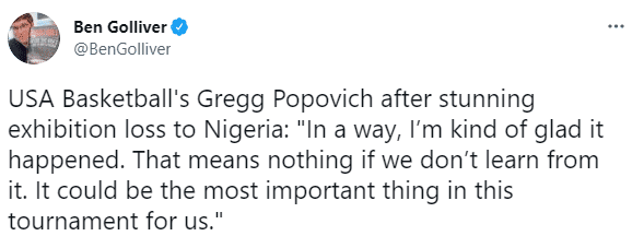 对于这一次失利,赛后美国男篮主教练波波维奇表示:从某种意义上说,我很高兴它发生了。如果我们不从中吸取教训,那将毫无意义。对我们来说,这可能是本次锦标赛中最重要的事情。