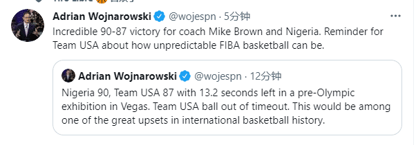 espn名记沃纳罗斯基第一时间发推:这是国际篮联史上最令人沮丧的事件之一;迈克-布朗带领尼日利亚击败美国男篮,提醒一下,美国队在国际赛场上的未来不可预测。