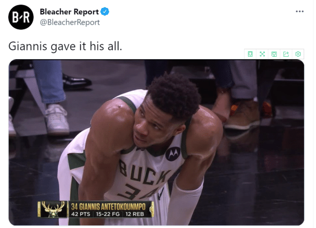 美媒Bleacher Report也晒出了字母哥的比赛图,写道:“字母哥已经付出了他的全部。”不过,雄鹿其他球员的表现确实不足以帮助字母哥赢球,米德尔顿和霍乐迪都成了铁匠,以至于NBA Memes连晒两张詹姆斯的神图,调侃字母哥目前的处境。