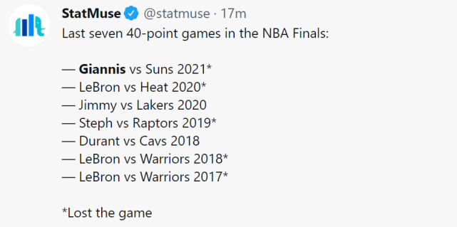 字母哥这样的高分,也赢不下太阳,充分说明了总决赛不是高分就能赢球的舞台。数据网站StatMuse列出了过去7次总决赛40+表现。他们分别是2017年对勇士的詹姆斯、2018年对勇士的詹姆斯、2018年对骑士的杜兰特、2019年对猛龙的库里、2020年对湖人的巴特勒、2020年对热火的詹姆斯以及2021年对太阳的字母哥。