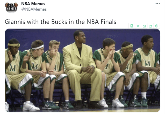 第一张图,詹姆斯一身便装,坐在高中队友中间。美媒的点评是“NBA总决赛里,字母哥在雄鹿的情况。”显然,美媒在讽刺雄鹿队友的实力。