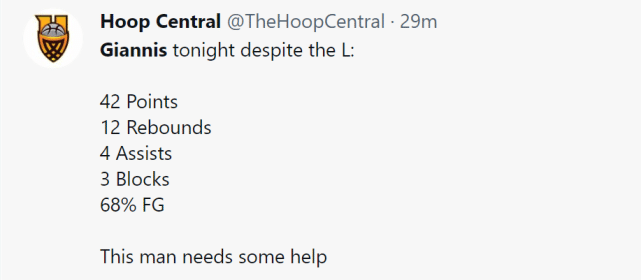 美媒Hoop Central列出了字母哥的数据,感慨道:“这个男人需要一些帮助”。