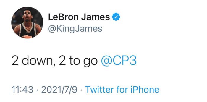 赛后,保罗好朋友詹姆斯第一时间发声,他在推特上表示:“拿下2场了,还差2场胜利@保罗”。詹姆斯曾在太阳赢下第一场比赛后就有过类似发声,看来詹姆斯在总决赛期间要一直目送太阳夺冠了。现在的问题就是詹姆斯到底会发几条推特,4条,5条,6条或者7条。