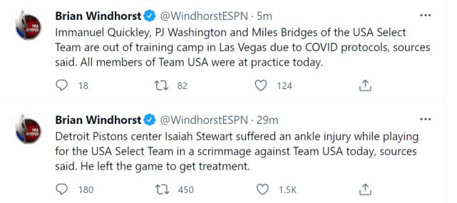 就在一天前,森林狼的状元爱德华兹,也因脚踝扭伤退出训练营的选拔队,有媒体拍到他一瘸一拐地离开球馆。另据文霍斯特报道,除了这两位受伤的球员,选拔队还有三名球员因新冠健康安全协议被隔离,目前也不在训练营里。这三位被隔离的球员分别是尼克斯的奎克利、黄蜂的华盛顿和布里奇斯。