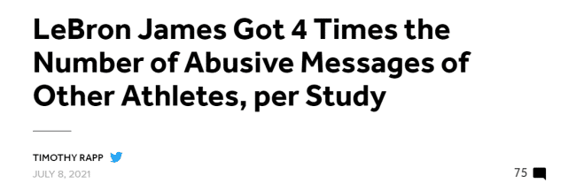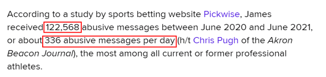 詹姆斯遭辱骂次数排第一!美媒公布研究数据:平均每天被骂336次