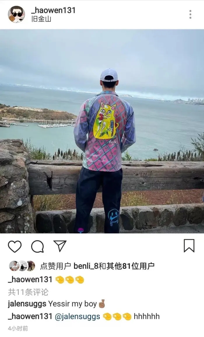 除此之外,郭昊文结交了不少热门选秀球员,频繁在社媒上互动,比如说他晒出自己刚下飞机,人在旧金山的游玩照,预测前3顺位且同属一个经纪公司的jalen suggs就立马赶来打call。