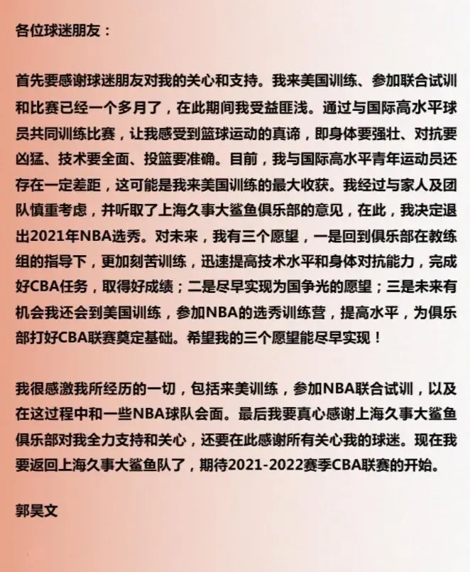 不过按郭昊文的意思,应该没有放弃追逐梦想的步伐,他个人表示这次经历会作为日后冲击NBA的更强动力