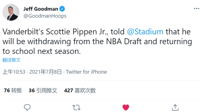 来源:JRS直播网07-08 15:39JRS直播网讯北京时间7月8日,据名记杰夫古德曼报道,公牛名宿斯科蒂皮蓬的儿子小斯科蒂皮蓬退出今年的NBA选秀,下赛季将返回范德堡大学。