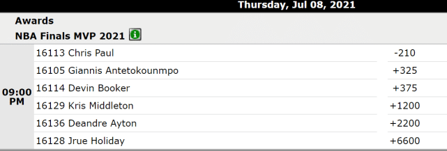最新的总决赛MVP赔率排名如下:保罗(-210)、字母哥(+325)、布克(+375)、米德尔顿(+1200)、艾顿(+2200)、霍乐迪(+6600)。