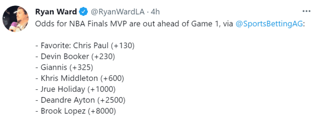 总决赛MVP赔率更新!保罗排名第一扩大优势,字母哥输球仍超越布克