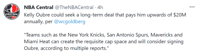 来源:JRS直播网07-08 10:57JRS直播网讯北京时间7月8日,据勇士记者Wes Goldberg报道,凯利-乌布雷正在寻求签下一份年薪2000万美元的多年合同,尼克斯、马刺、独行侠和热火会考虑签下这位小前锋。