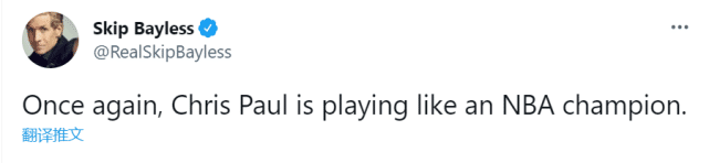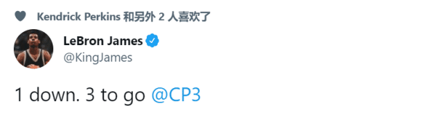 这场比赛结束之后,活跃在社媒的詹姆斯,自然也不会错过恭喜自己好友保罗的机会。他发推表示:“1场胜利已经收下,还差3场胜利”。本赛季的季后赛,保罗和詹姆斯也迎来了交手,最终太阳率队淘汰湖人晋级西部半决赛。