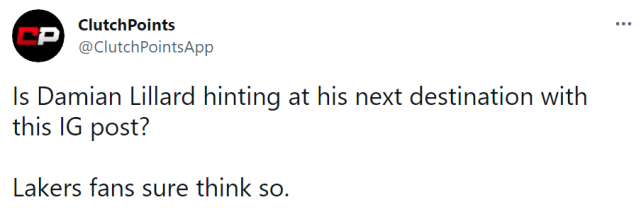 这张照片的背景是斯台普斯中心,而且是明显的湖人紫金配色。很快,不少球迷在利拉德的评论区写道:“利拉德确认去湖人了。”美媒clutchpoints也凑热闹点评道:“利拉德是在暗示他的下一站是湖人吗?湖人球迷肯定这么想。”