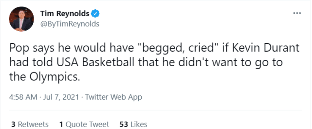 作为这支球队中最大牌的球星,杜兰特承诺参加奥运会,无疑为美国男篮冲击冠军增加了一块最重的砝码。在今天的采访中,波波维奇也调侃起这位爱将:“如果凯文-杜兰特告诉美国男篮他不愿意来参加奥运会,我会哭着去求他。”