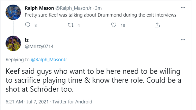 庄神的这番话,也引起热议。湖人数据专家Ralph Mason直言:“我非常确定Keef(马基夫-莫里斯)在赛季结束前的采访里说的就是德拉蒙德。”莫里斯在那次采访中曾表示:“想留在这里的人,得愿意牺牲上场时间,而且了解自己的角色。”当然,莫里斯提到的人,也可能包括施罗德。施罗德加盟湖人时,也曾要求首发位置和出场时间。
