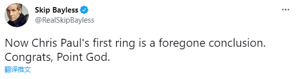 名嘴斯基普-贝勒斯不仅发推盛赞保罗打得像总冠军,更是直言:现在保罗获得生涯第一枚总冠军戒指已成定局,恭喜控卫之神。